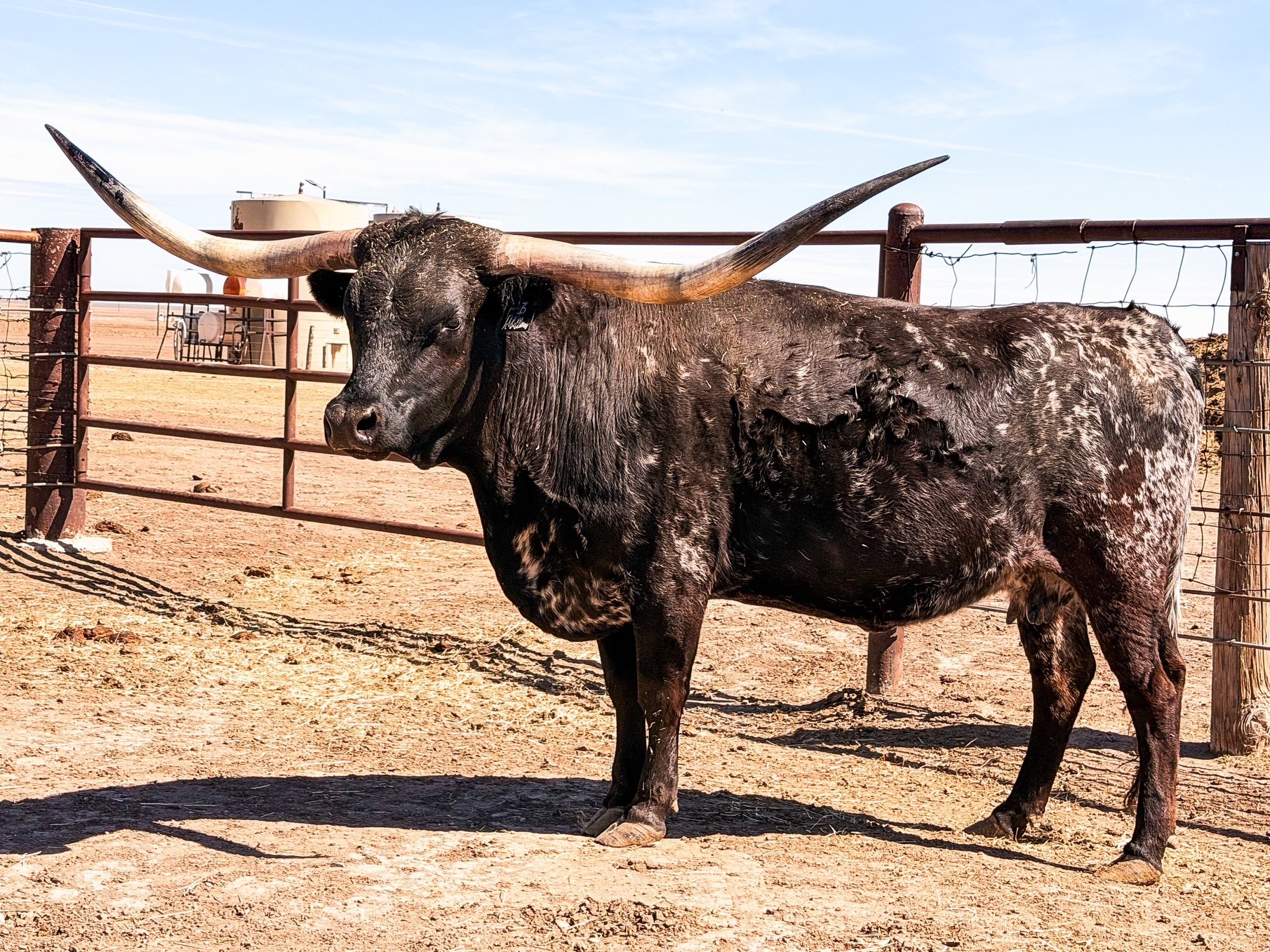Flashy black and white beauty with the beginning of the iconic lateral horns twisting most elegantly. She had a dark Grulla speckled heifer in November 2021. Her dam is a daughter of Overkill bringing size, milk, and black color to the table. Her sire is the syndicated Rebel HR. The color options are unstoppable with an elegant twist. Her half sister HR Rosette sold for $700k and Awesome Reb for $140k at the 2022 Legends Sale most recently. The list goes on for what Rebel HR genetics can do to enhance your herd and Rebellious is a proven producer herself. She's given us 3 really nice heifers in a row.