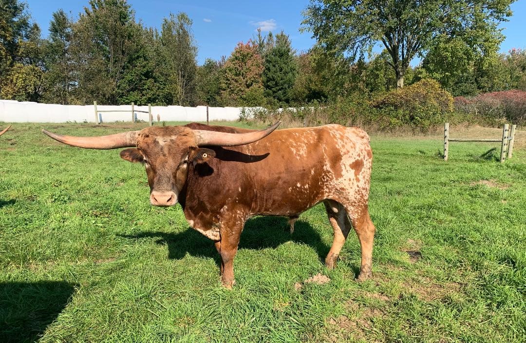 Great young bull, big bodied and good horn direction.